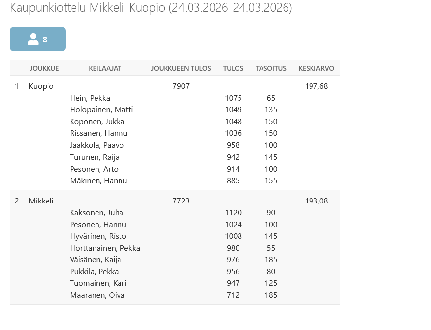 Kuopion ja Mikkelin veteraanikeilaajat iskivät yhteen pitkän tauon jälkeen 24.3.2026 kaupunkiottelussa Rauhalahti Bowlingissa. Kisa keilattiin kahdeksan keilaajan joukkuein ja viiden sarjan kisana. Kisan puuhamiehinä häärivät Mikkelin/Kuopion Risto Hyvärinen ja Kuopion päässä Rauno Airas.